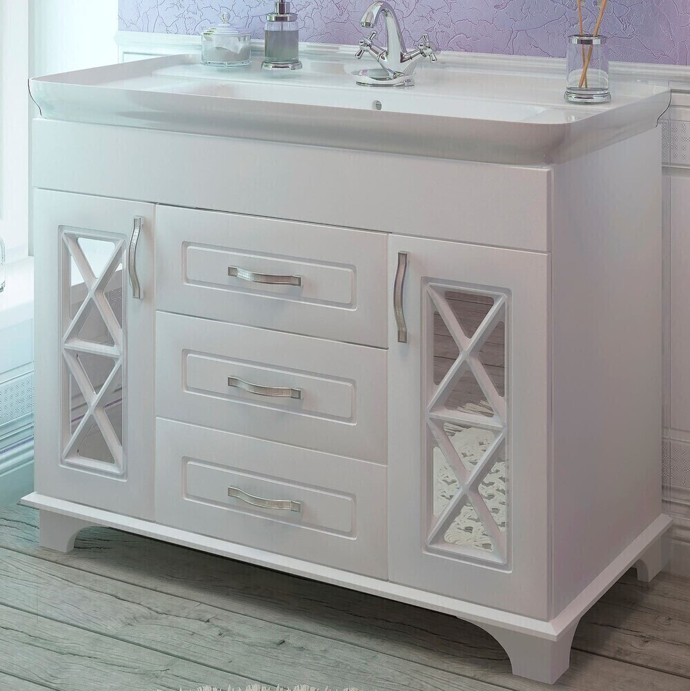 Коллекция Duglas-роскошный вариант по доступной цене. Данный комплект преобразит ванную комнату даже с самым незатейливым интерьером. Фасады с зеркальными вставками, изящная фрезеровка, дорогая фурнитура-все это привнесет в помещение атмосферу романтики, чистоты и уюта. Большое зеркало с узорным верхним краем зрительно расширит пространство.