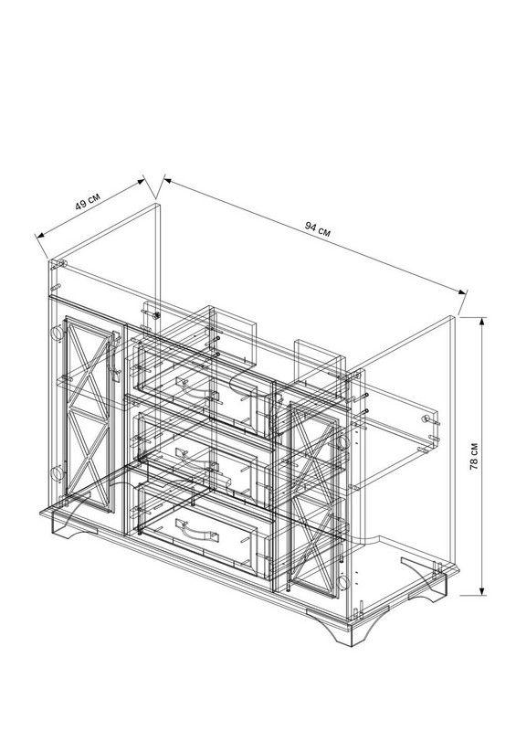 | Комплектация | 3 ящика, 2 дверцы, 2 полки, 5 ручек, 4 ножки |