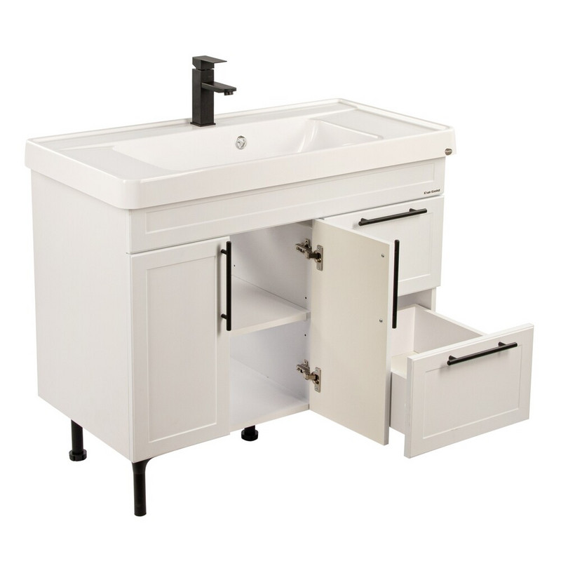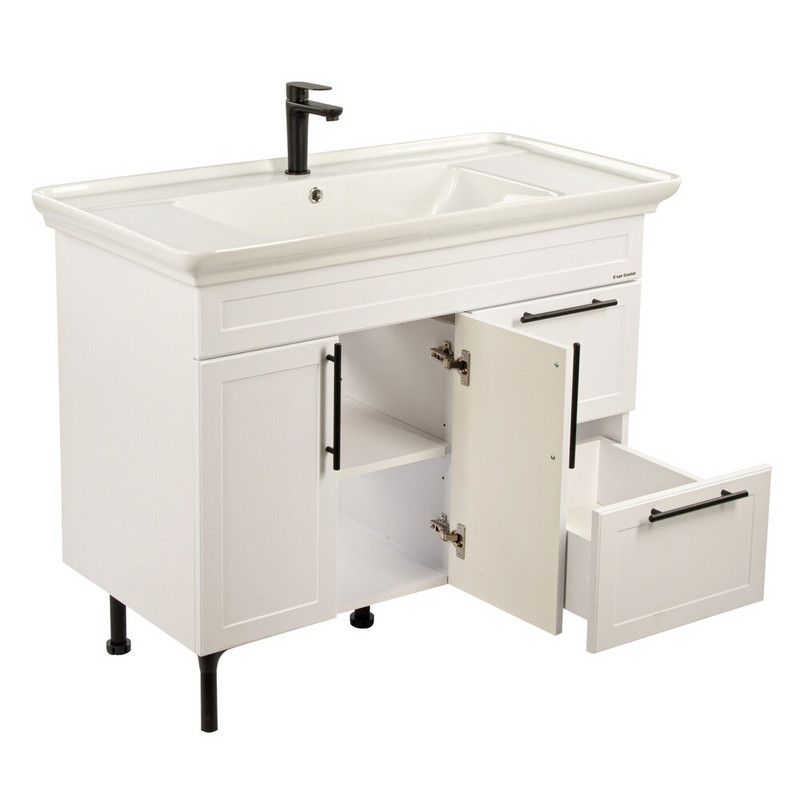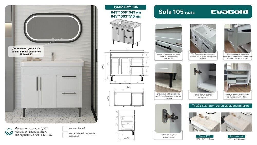 Идеальный баланс минимализма и функциональности тумбы Sofa 105 покорит ваших покупателей. Сочетание белого матового фасада и лаконичной черной фурнитуры создаст стильное и современное пространство. Тумба комплектуется двумя умывальниками на выбор.