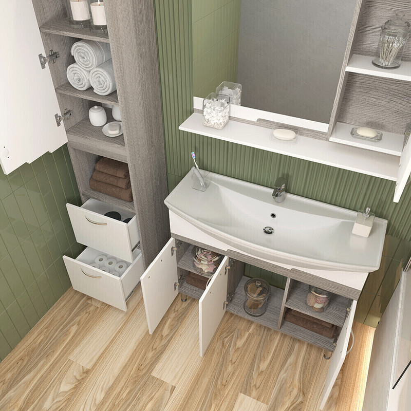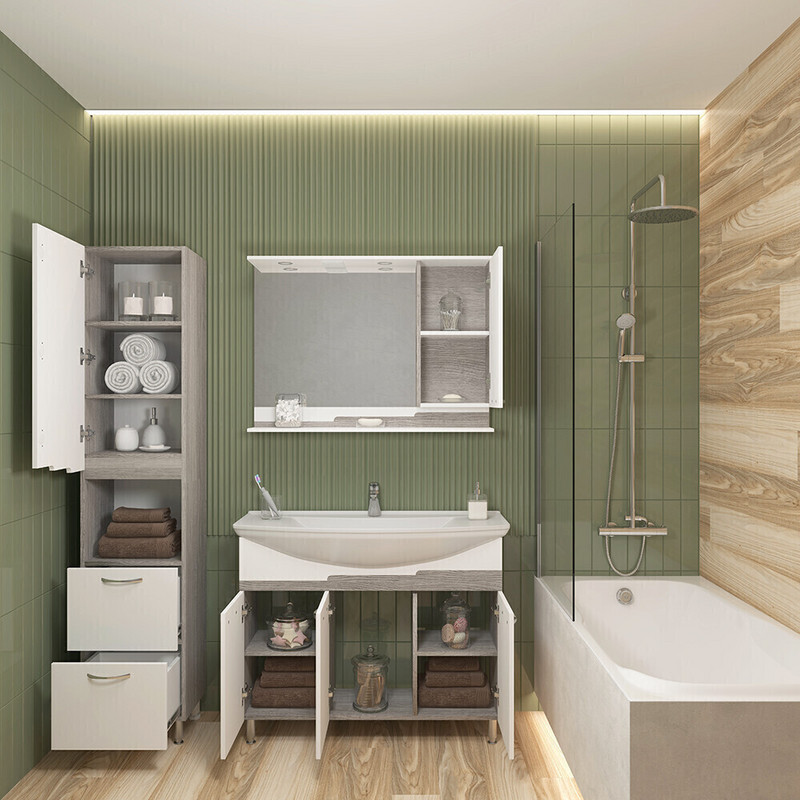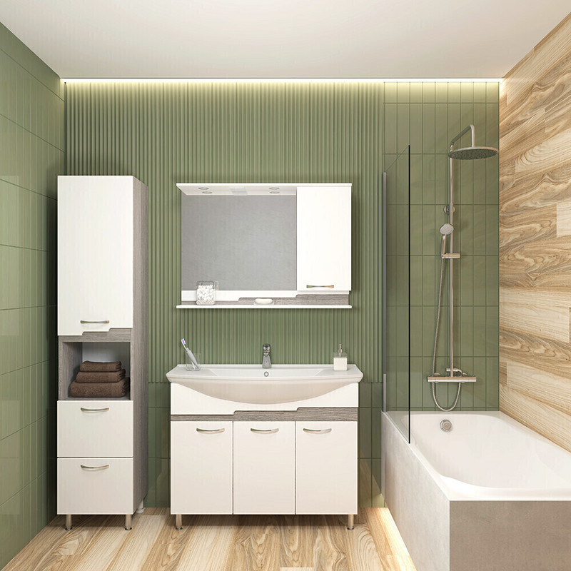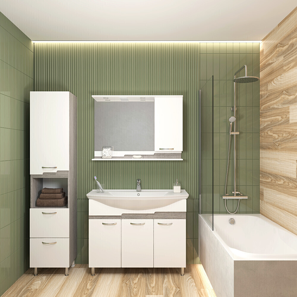 Коллекция Каскад выполнена в современном стиле, которому присущи комфорт, эргономичность и практичность. Коллекция включает в себя напольную тумбу, зеркало-шкаф с подсветкой и пенал. Ненавязчивые вставки древесного оттенка в сочетании с белым цветом, плавная геометричность линий идеально впишутся в интерьер в экостиле. Моринга - это темный оттенок серо-коричневого, который имеет глубокий и насыщенный цвет. Он прекрасно придаст натуральности интерьеру. Зеркало оснащено подсветкой, удобной отрытой полкой по всей длине и небольшим шкафчиком с распашной дверцей.