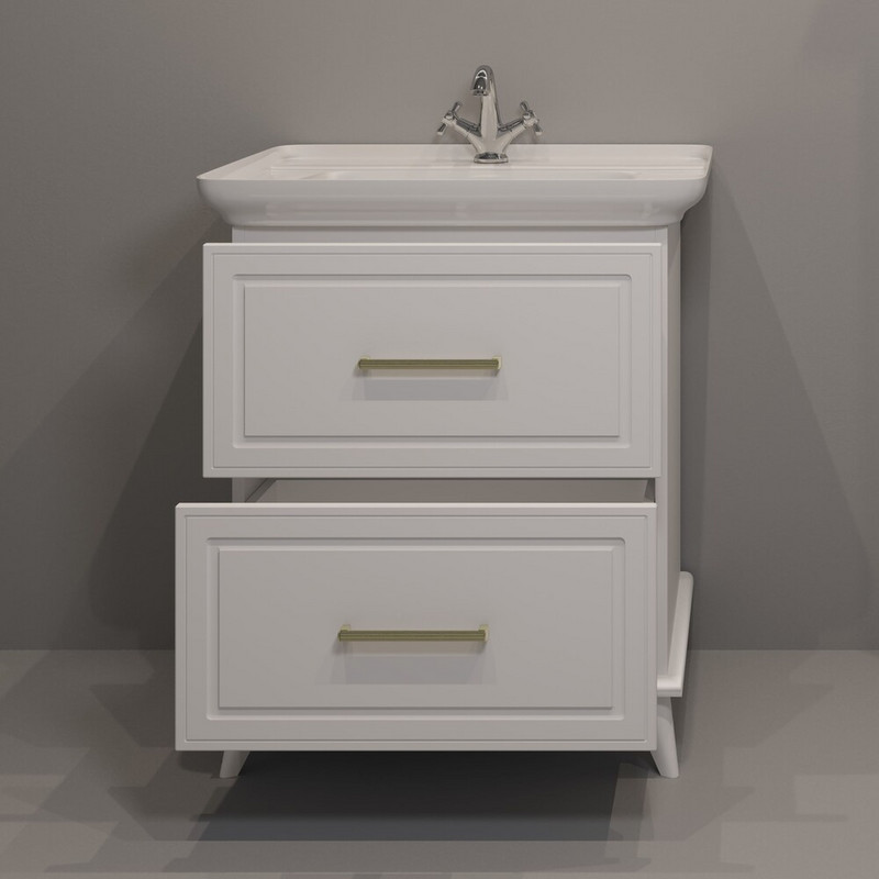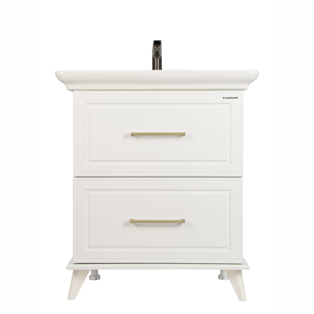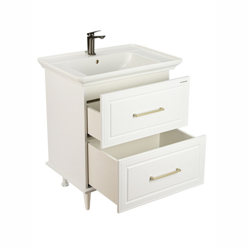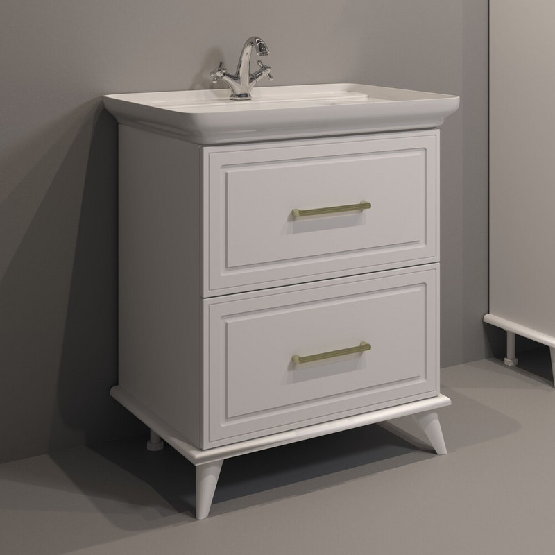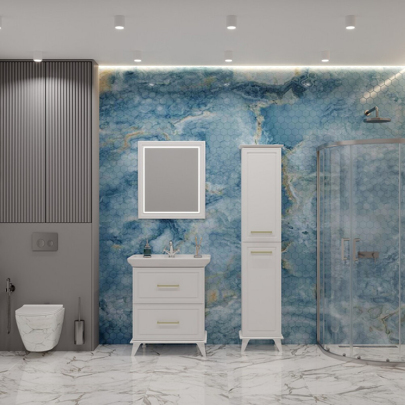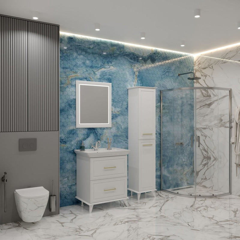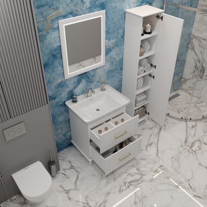 Новая коллекция мебели Michael 75 от бренда EvaGold создана для тех, кто ценит изящество неоклассики и высокую функциональность. В основе комплекта — экологичный и прочный МДФ, облицованный пленкой ПВХ с покрытием soft-touch, придающим поверхности мягкость и приятные тактильные ощущения. Особенности комплекта: Тумба оснащена скрытыми направляющими, что обеспечивает плавное и бесшумное закрывание ящиков. Зеркало с LED-подсветкой создает эффект мягкого света, добавляя атмосферы уюта и элегантности. Дизайнерские опоры и металлические ручки в трендовом цвете "матовое золото" придают мебели изысканный акцент. Лаконичная фрезеровка подчеркивает стильную геометрию форм и создает гармонию в дизайне. Образ завершает умывальник "Дуглас 75" от бренда Kirovit — идеально сочетающийся элемент, который дополняет коллекцию своей утонченностью и практичностью. Michael 75 — это не просто мебель для ванной комнаты, это гармония формы, цвета и функциональности, способная преобразить любое пространство в оазис стиля и комфорта.