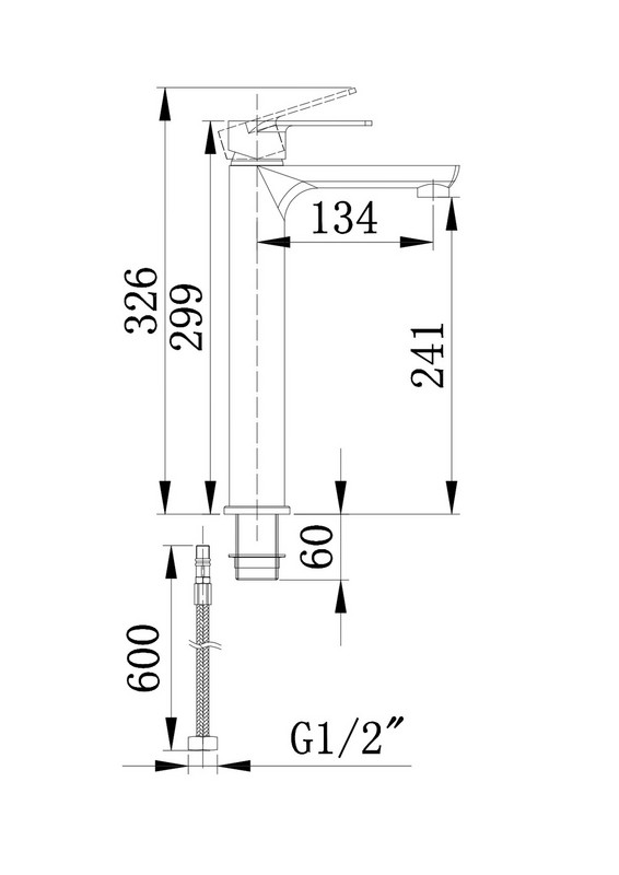 Высокий cмеситель для умывальника Материал корпуса - латунь Ручка - цинк Гибкий шланг - 2шт 1/2, 50 см, нерж.сталь