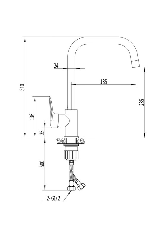 Смеситель для кухни Материал корпуса -нерж.сталь Ручка - цинк Насадка для душа - высококачественный пластик Излив - нерж.сталь Гибкий шланг - 2шт 1/2, 50 см, нерж.сталь