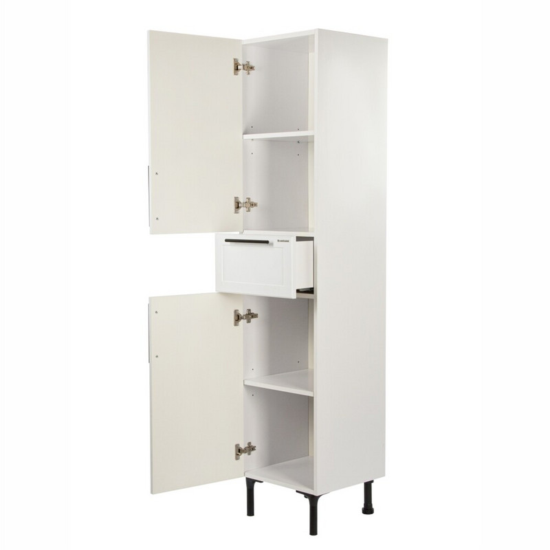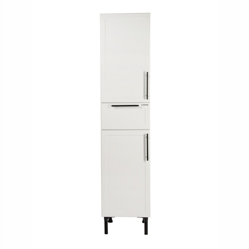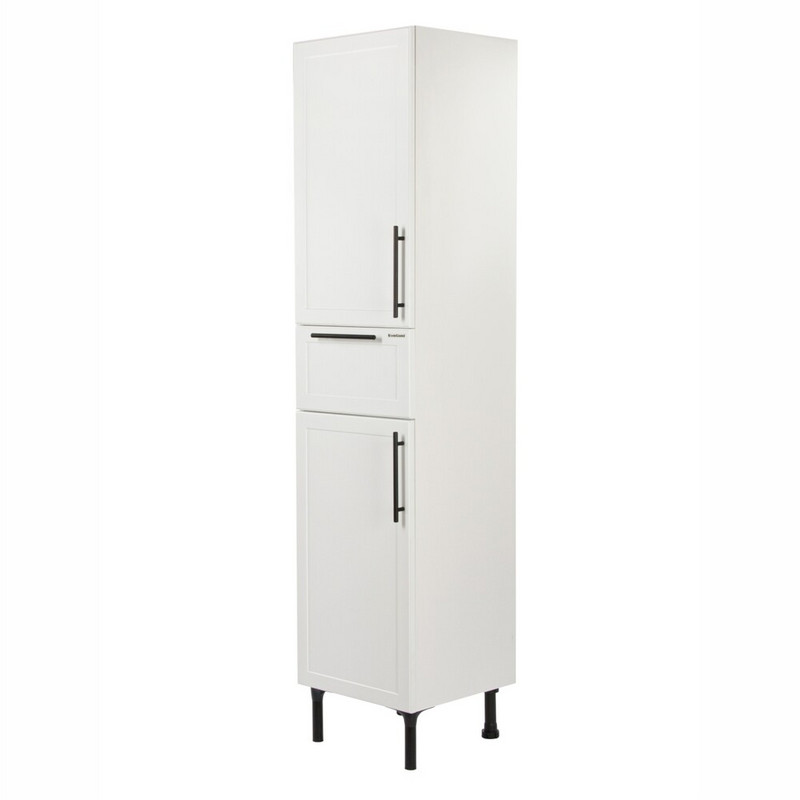 Пенал-шкаф Sofa для ванной комнаты — это элегантное и функциональное решение для хранения. Шкаф выполнен в современном стиле и имеет компактные размеры, идеально подходящие для небольших помещений. Его ширина составляет 400 мм, что позволяет ему органично вписаться в любое пространство. Корпус пенала окрашен в белый цвет с текстурой шагрень, придающей поверхности приятную матовость и устойчивость к царапинам. Внутри шкафа предусмотрен один выдвижной ящик, удобный для хранения мелочей, и четыре просторные полочки, которые обеспечивают достаточно места для хранения полотенец, косметики и других принадлежностей. Завершающий штрих — черные матовые ручки, которые подчеркивают современный дизайн и добавляют контрастность. Этот пенал-шкаф станет стильным и практичным дополнением любой ванной комнаты.