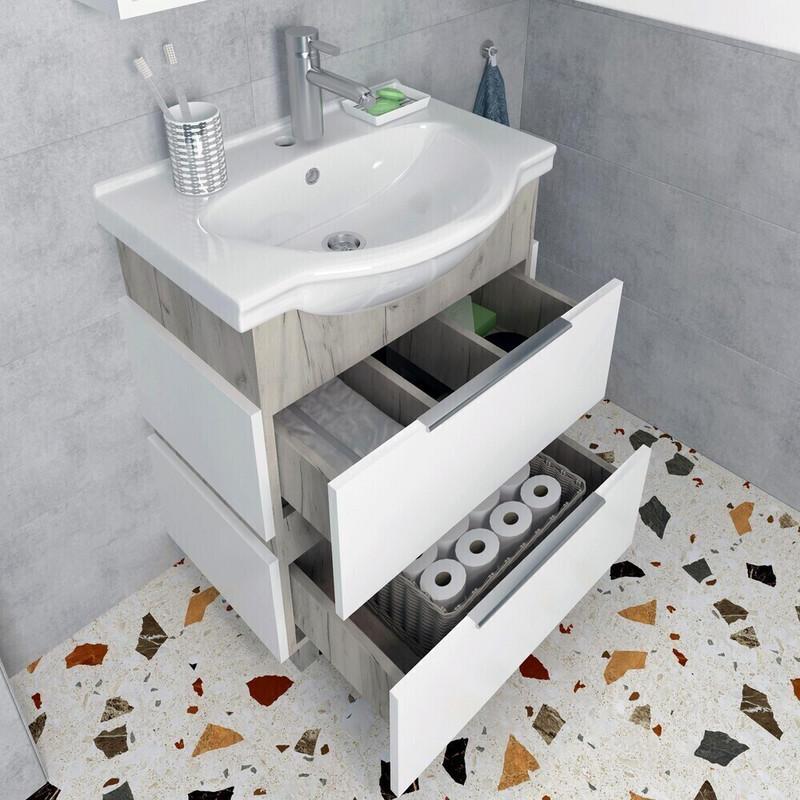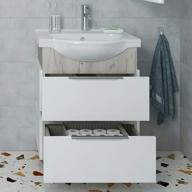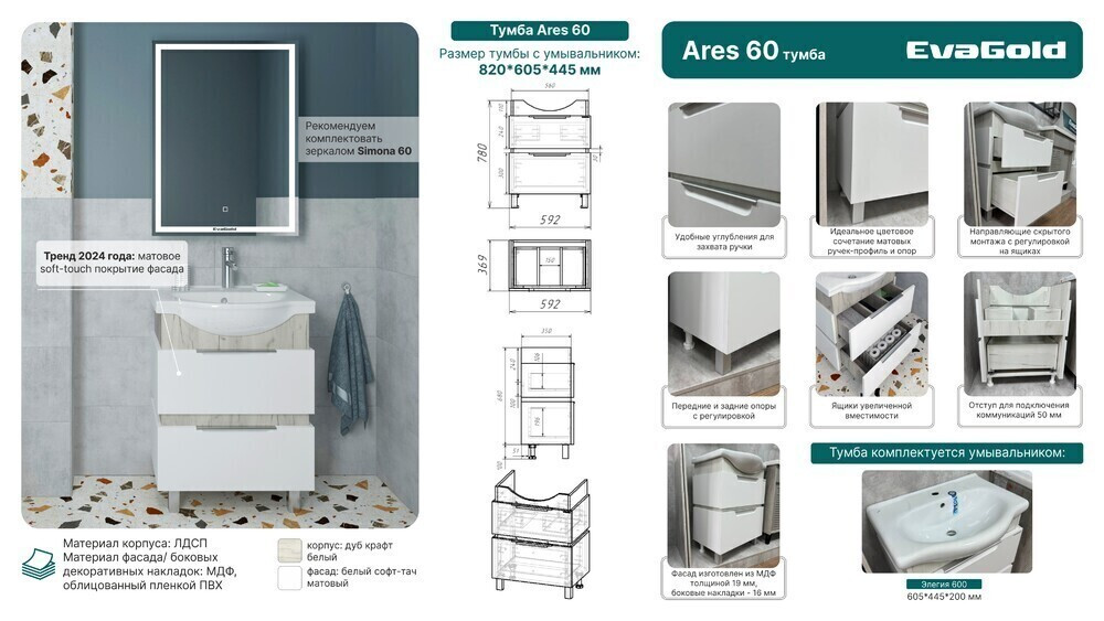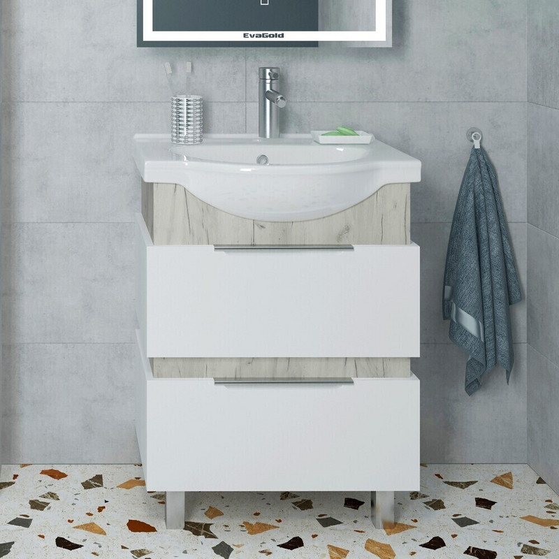 Тумба Ares в 60м размере идеально подходит для создания стильного и удобного пространства даже в небольших ванных комнатах. Белый глянец придаёт тумбе современный и утончённый вид, отражая свет и визуально увеличивая пространство. А корпус в цвете дуб крафт белый добавляет естественное тепло и гармонию, создавая контраст и стильное сочетание с фасадом. Два просторных ящика с плавным механизмом открытия обеспечивают удобное и организованное хранение ваших вещей, поддерживая порядок и чистоту. Тумба комплектуется белоснежным умывальником Элегия 60.