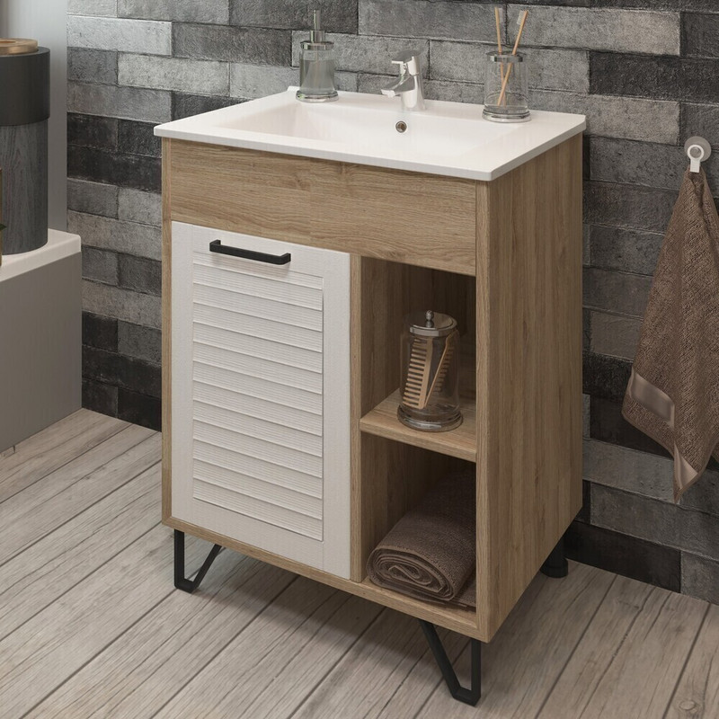 Коллекция выполнена в скандинавском стиле. Простой и лаконичный дизайн дополнен оригинальным фасадом с 3D панелью в цвете – белое дерево. Открытые полочки в тумбе и зеркале дают ощущение необычной легкости и свежести. Изящные черные ножки придают выразительность коллекции, а также обеспечивают надежность и устойчивость тумбы.