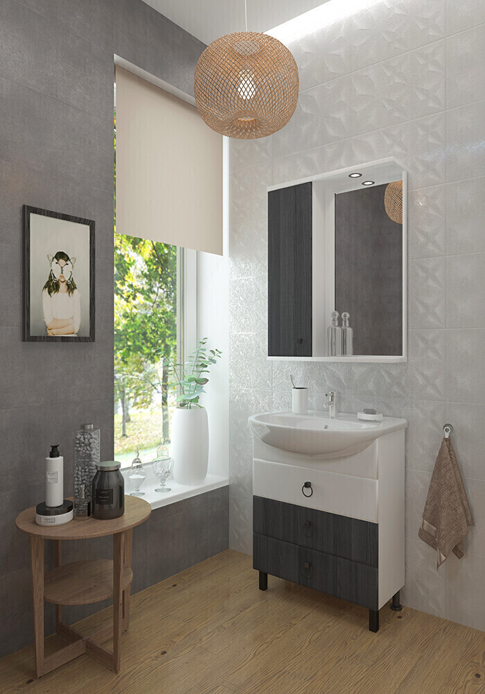 Arcada — коллекция мебели для ванных комнат в скандинавском стиле. Данный комплект выделяет интересное цветовое решение - роскошный оттенок лиственницы и благородный белый, которое привнесет в Вашу ванную чувство умиротворения и спокойствия.