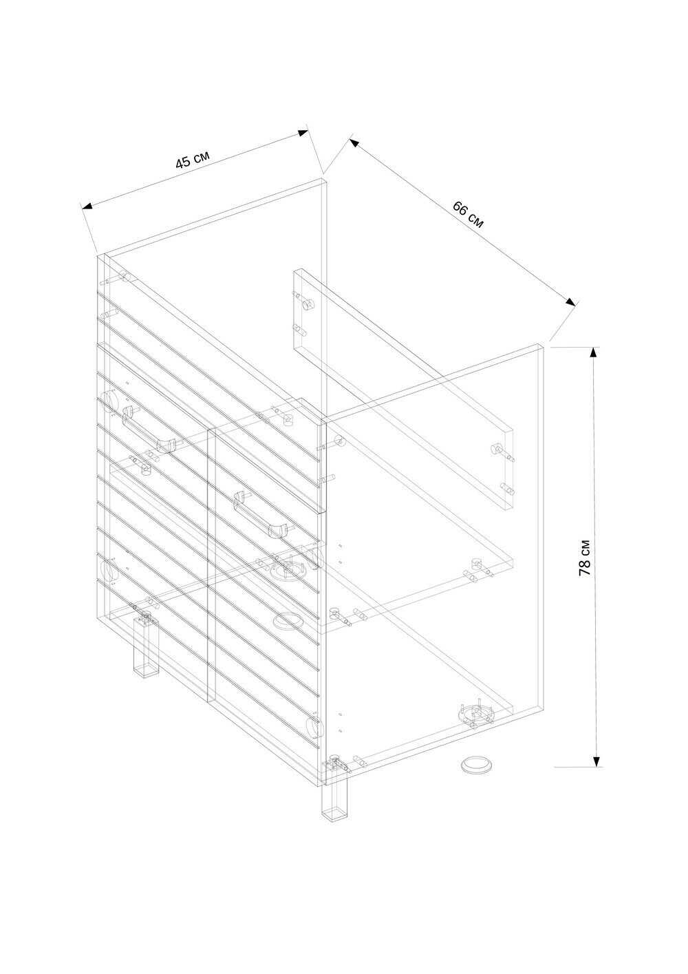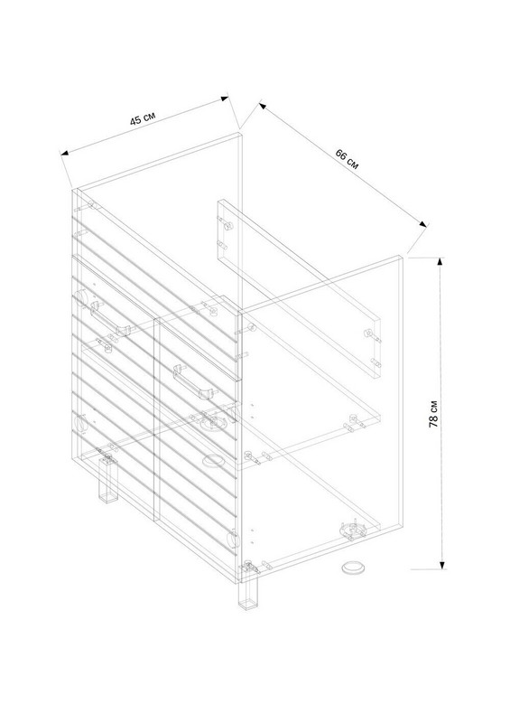 | Комплектация | 2 дверцы, 1 полка, 2 ручки, 4 ножки |