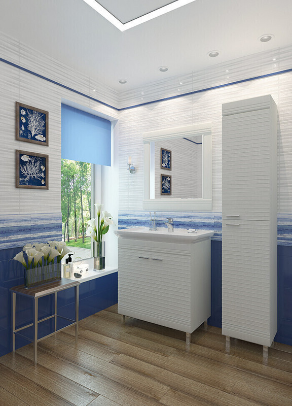 В коллекции мебели Roxy стандартные современные изделия — тумба под раковину и зеркальный шкаф — оживлены интересными идеями: горизонтальными фрезерованными линиями, имитирующими жалюзи и необычными ручками. Модель имеет классическую цветовую гамму — белоснежные поверхности в сочетании с хромированными элементами.