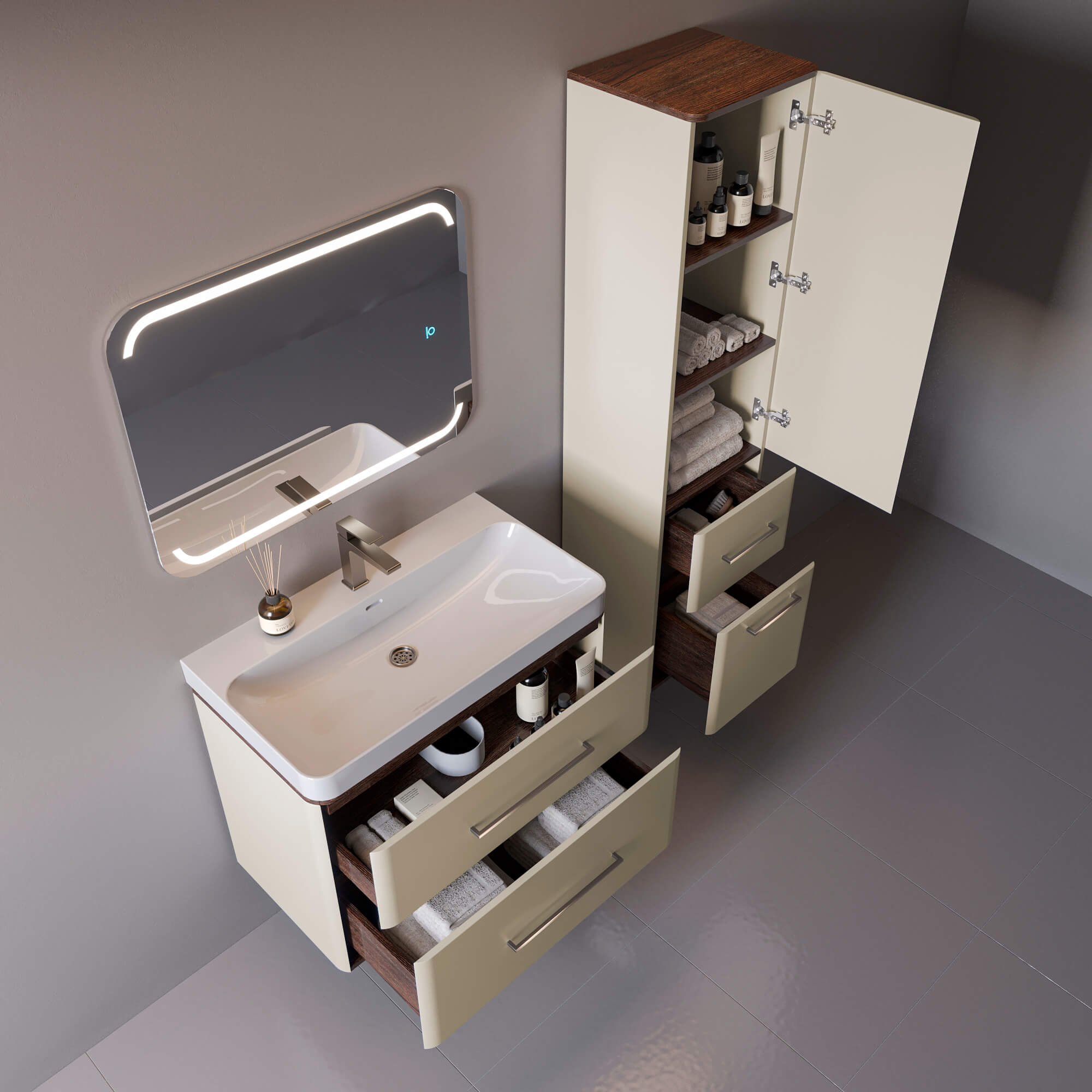 Плавные, скруглённые линии фасадов и умывальника перетекают друг в друга, создавая цельный, «обтекаемый» силуэт. Это дизайн, который смягчает пространство, наполняет его уютом и визуально делает интерьер более просторным и гармоничным.