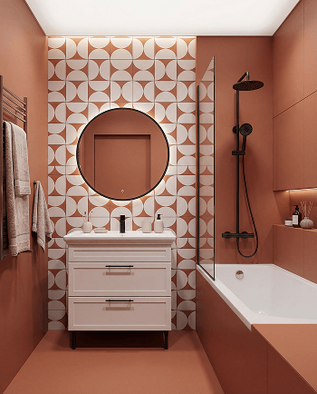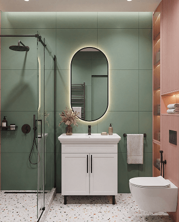 Контрастные черные матовые ручки-скобы не только удобны, но и задают тон всей ванной комнате. Они легко «ловят» смеситель в тон и помогают собрать единый, стильный образ.