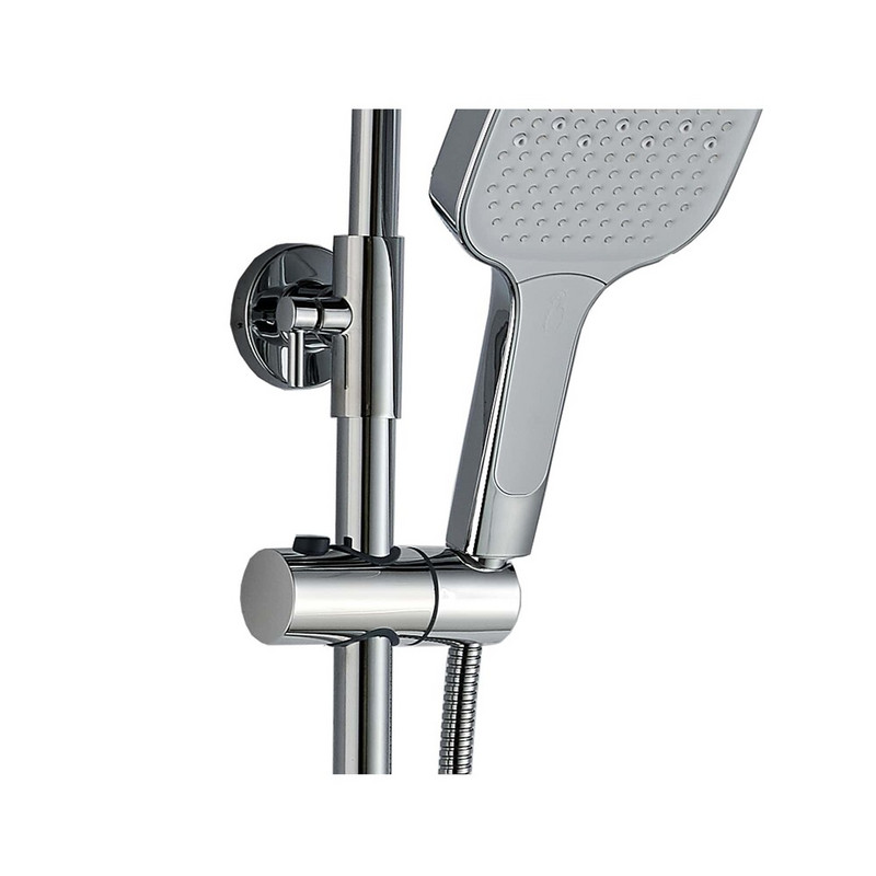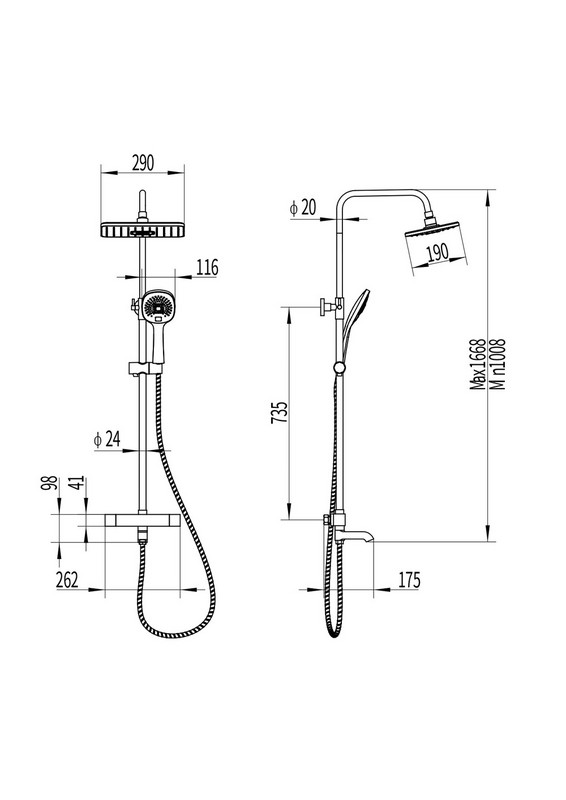 Высота регулируется от 1008 до 1668 мм Набор для душа Материал штанги - ЛАТУНЬ Материал бруска - S/S Материал верхней части обуви - высококачественный пластик Материал ручного душа - высококачественный пластик Ручка - цинковая Излив - нержавеющая сталь Шланг для душа - 1,5м, ПВХ