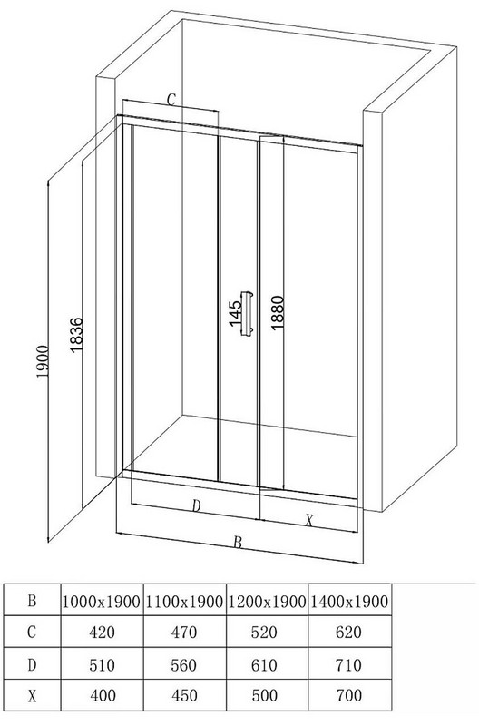 EG1CF Душевое ограждение в проем EvaGold 100х190, профиль хром, рифленое стекло