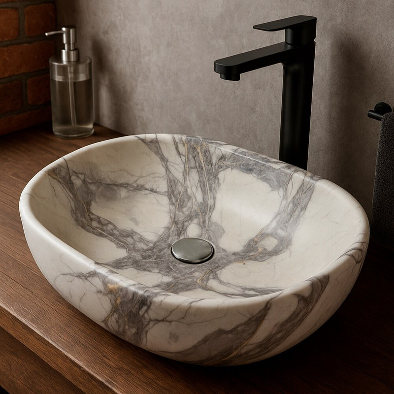 Умывальник накладной A257A-P305M мрамор белый овальный без перелива (485*350*140 мм)